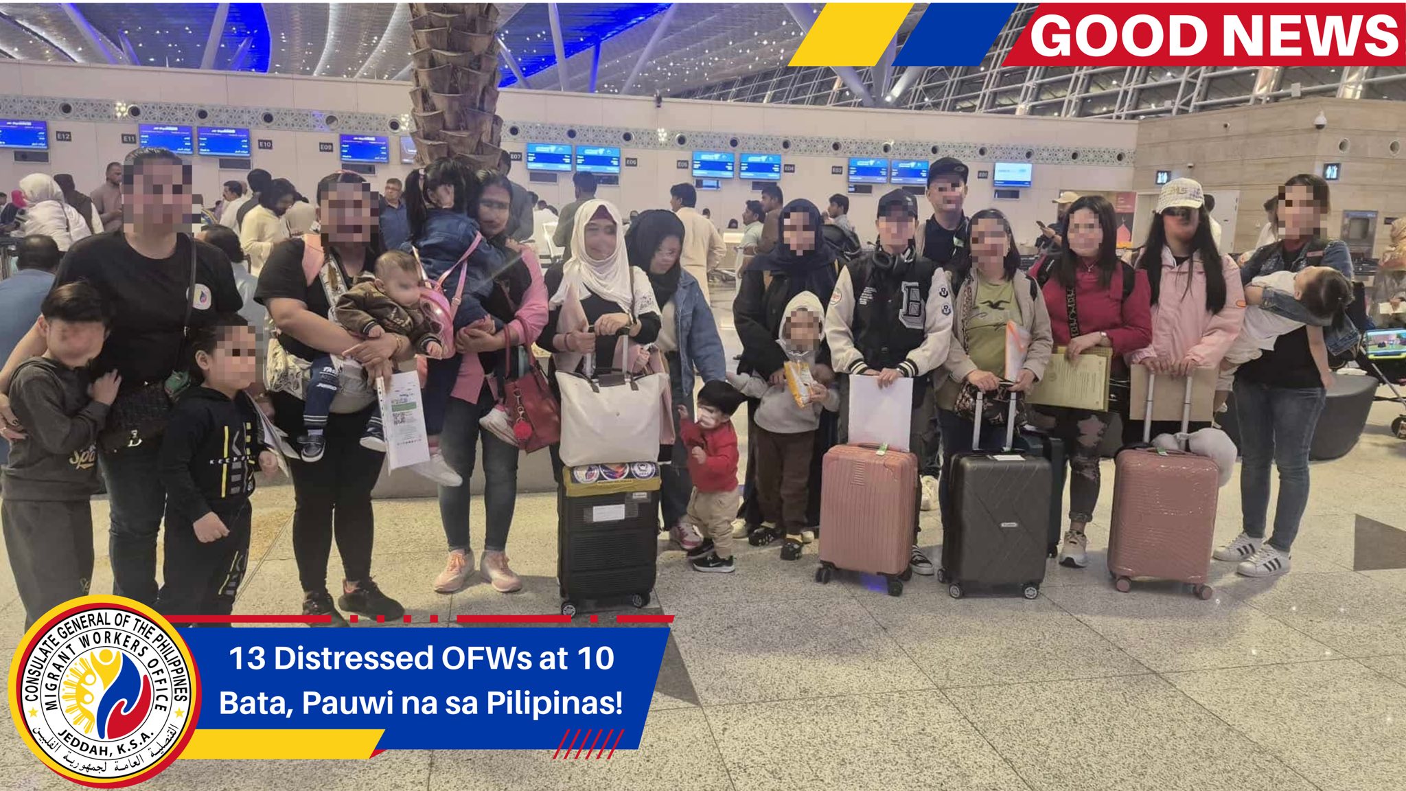 Thirteen distressed overseas Filipino workers (OFWs) and ten children are finally on their way home to the Philippines, thanks to the assistance of the Migrant Workers Office (MWO) in Jeddah. The repatriation, completed through close coordination and proper case handling, marks another milestone in the government’s ongoing support for Filipinos in distress abroad.
