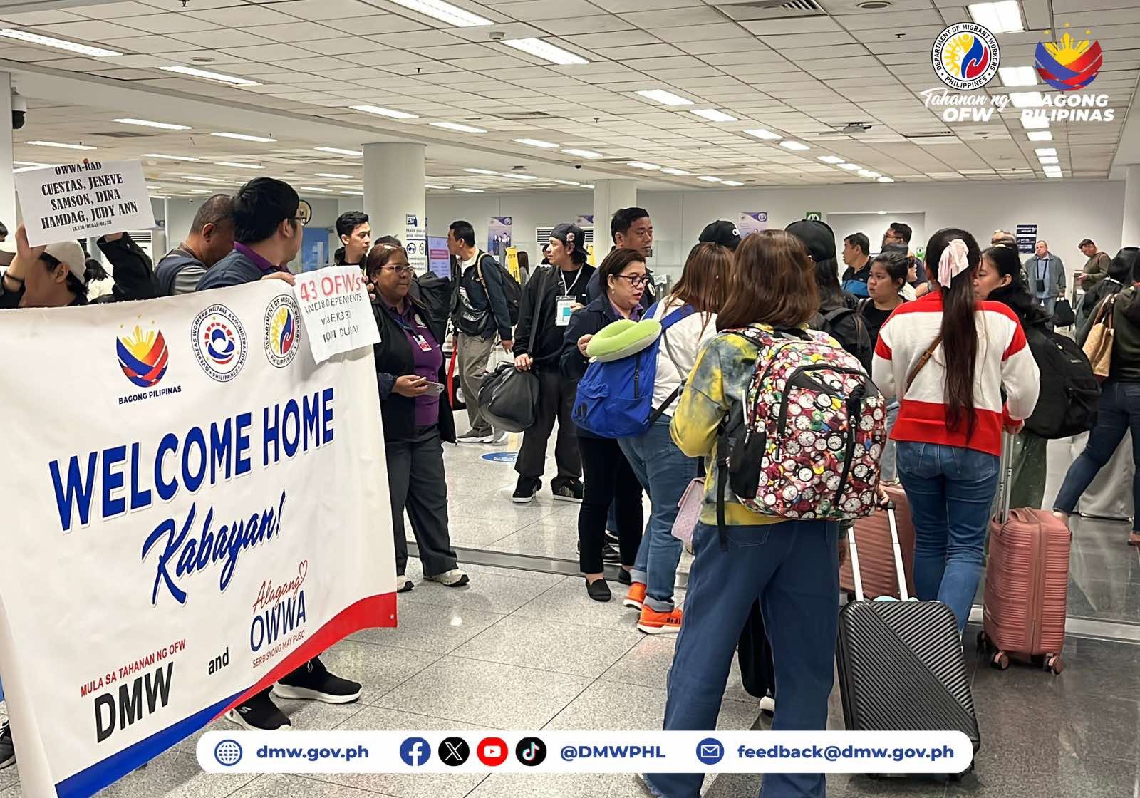 Their arrival was coordinated through a whole-of-government response led by the Department of Migrant Workers, with the Philippine Embassy in the UAE, the Migrant Workers Office in Dubai, OWWA, DSWD, DOH, and the MIAA Medical Team all playing active roles in the operation.