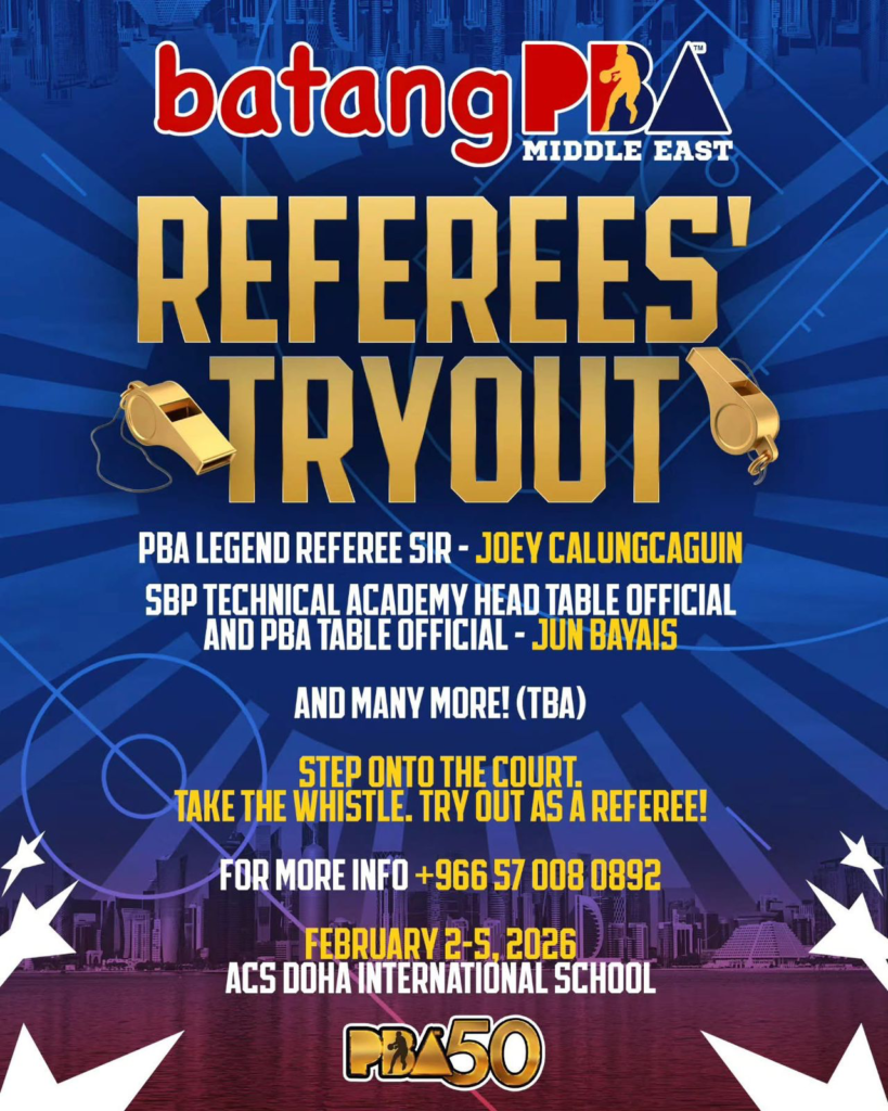 Batang PBA Middle East has announced a regional referee tryout as part of its preparations for the upcoming youth basketball tournament scheduled in Doha this February. The tryouts will be held from February 2 to 5, 2026, at ACS Doha International School, just days ahead of the Batang PBA Middle East tournament dates.
