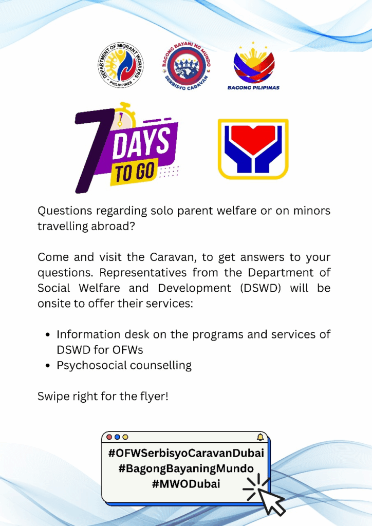The Department of Social Welfare and Development (DSWD) will be among the 10 participating government agencies at the upcoming Bagong Bayani ng Mundo: OFW Serbisyo Caravan on August 3, 2025, at Exhibition Hall 8, Dubai World Trade Center (DWTC), bringing essential support services to Overseas Filipino Workers (OFWs) and their families in the UAE.
