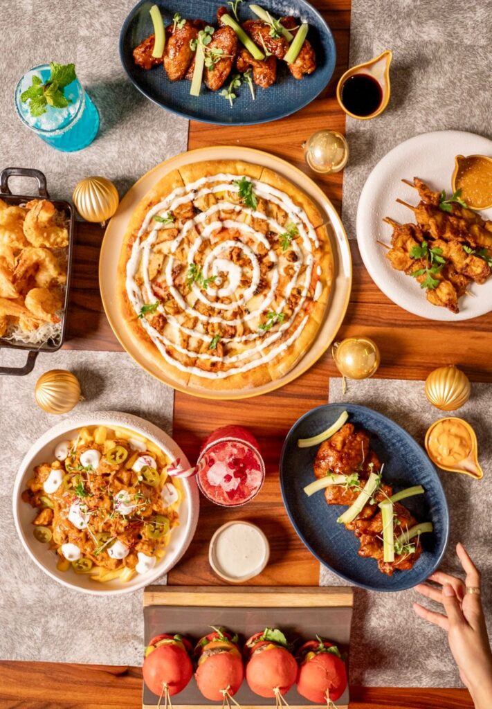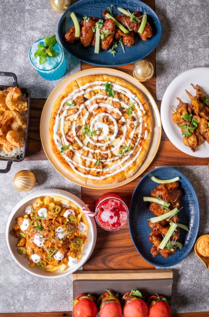 The second bundle is designed for more energetic celebrations, combining bar-style bites with flexible drink selections. The menu features items such as smoked salmon arugula salad, torpedo shrimps, tandoori chicken tikka pizza, and Cajun chicken nachos. Beverage options include hops towers, iced tea towers, cocktail towers, or a bottle of spirits, complemented by flavored shooters such as Blue Kamikaze and Lemon Drop.
