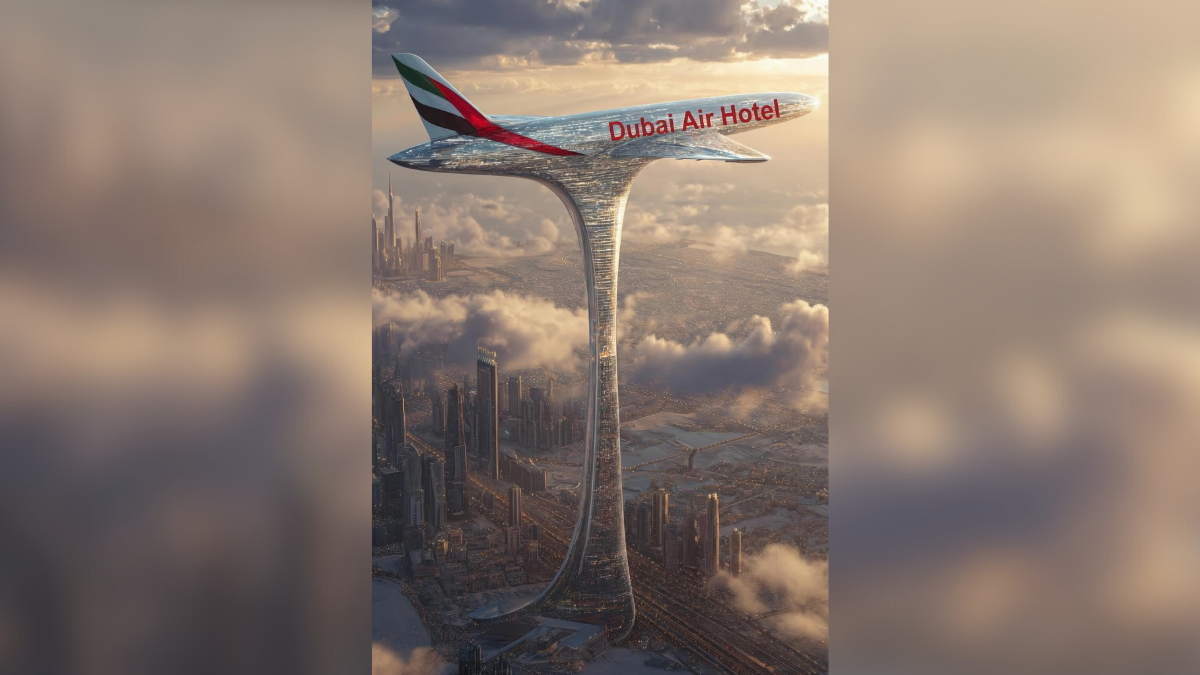 The footage, which circulated widely across social media and news platforms, presents what looks like a futuristic hospitality landmark branded as an Emirates-linked “Dubai Air Hotel.” The digital render suggests a luxury tower rising hundreds of metres into the sky, with a full-scale aircraft mounted on its roof, a visual that many viewers assumed reflected a genuine development proposal.