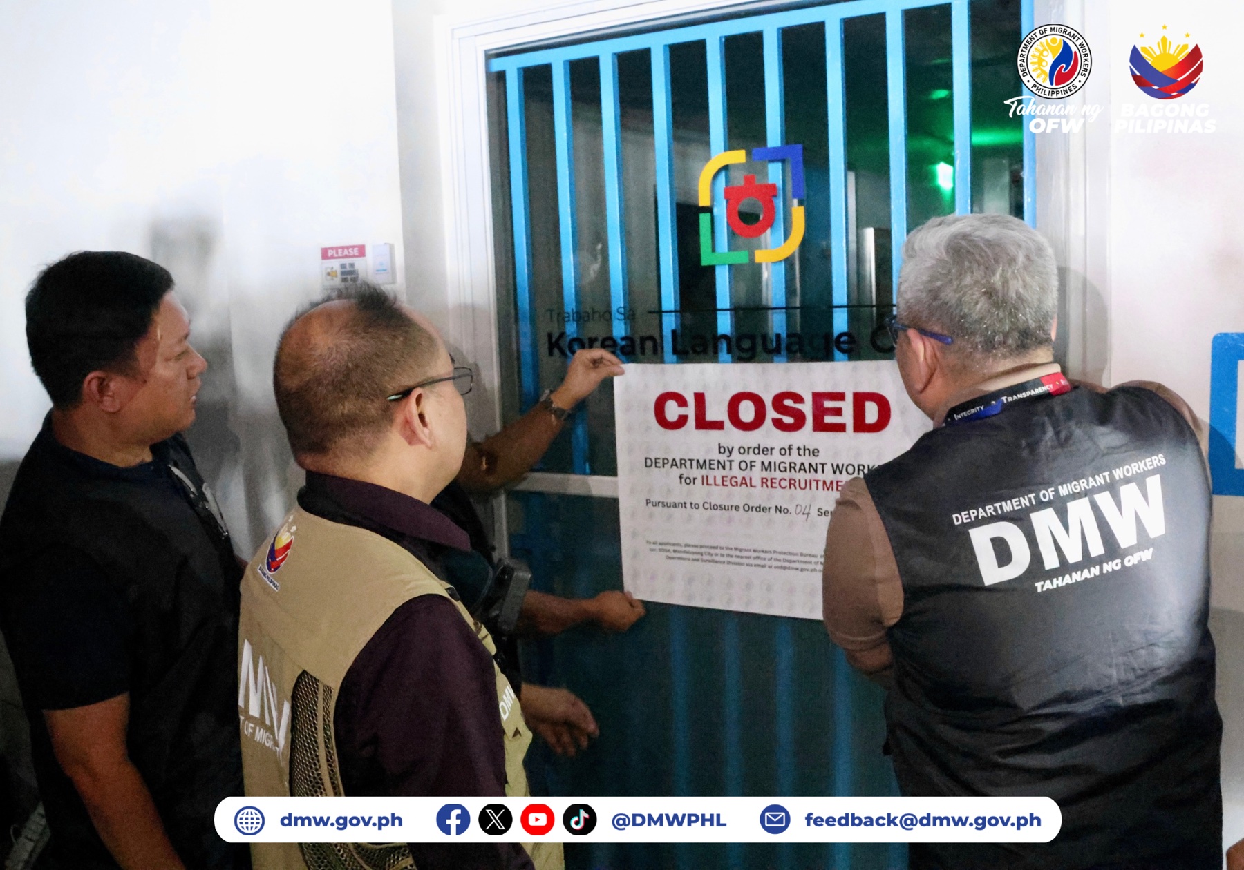 The shutdown of Trabaho sa Korea Language Center (TSKLC) was carried out on March 12, 2026, by the Department of Migrant Workers together with the PNP-Mabalacat. DMW Assistant Secretary Jerome A. Alcantara and Migrant Workers Protection Bureau Director Romelson Abbang led the operation.