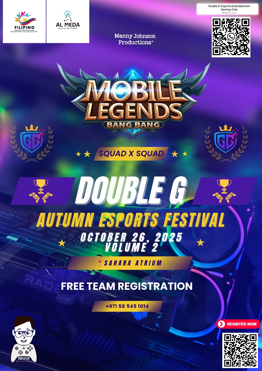 According to the organizers, the tournament will serve as a celebration of Filipino entrepreneurship and marketing synergy, highlighting how gaming can open new opportunities for collaboration within the business community. Registration for the event is free but limited, with interested participants encouraged to sign up via WhatsApp at +971 58 545 1014 or through the Double G Esports Entertainment Facebook page.