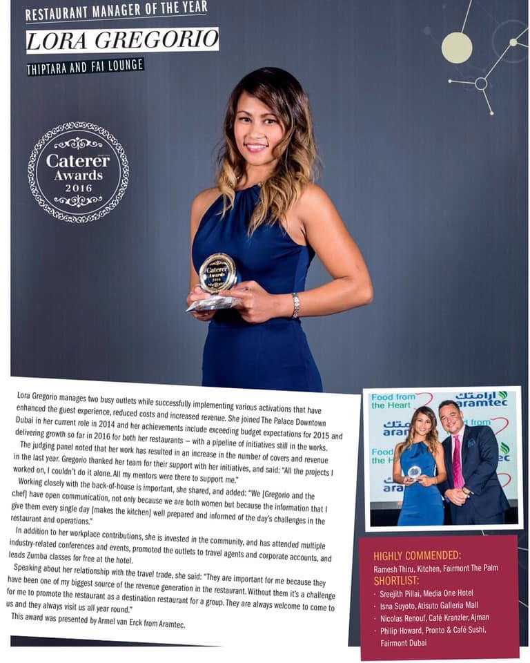 Her progression was not just about climbing the corporate ladder. It was also about proving herself, time and time again, in an industry known for its high demands. “Starting from an entry-level position, I worked my way up through various roles, gaining valuable experience and proving myself in every step,” she says. “My dedication was ultimately recognized in 2016 when I obtained a huge accolade of being awarded the Restaurant Manager of the Year, Caterer Middle East Award.”
