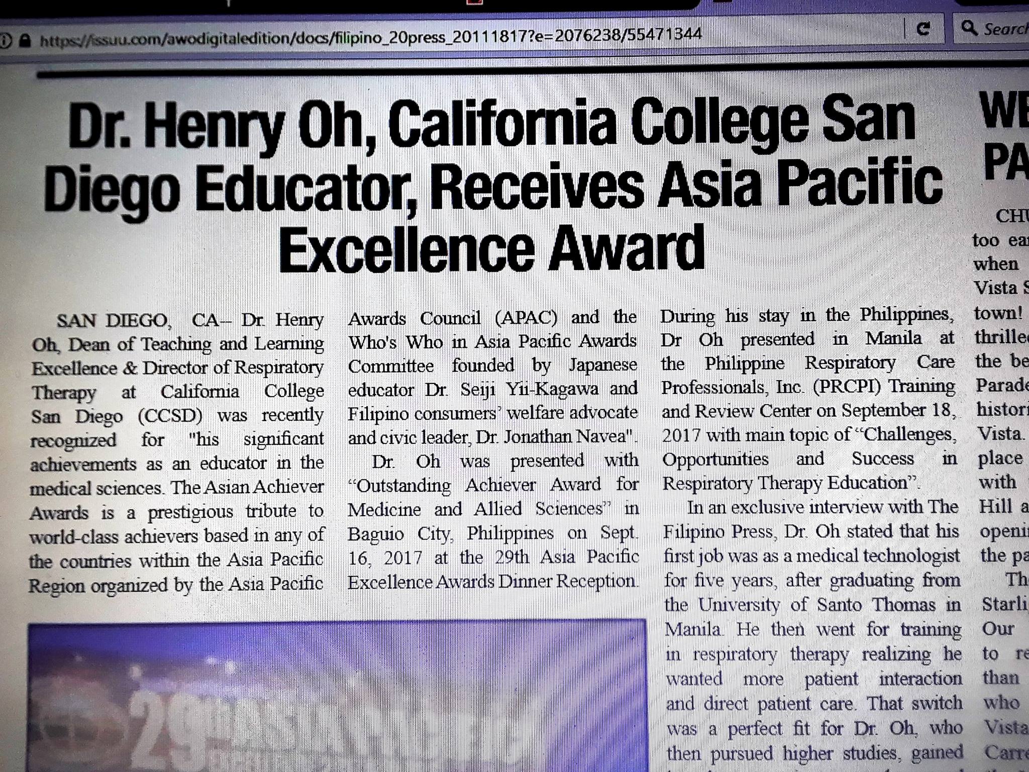 Over three decades abroad, Dr. Oh has been recognized nationally and internationally for his achievements. His awards include the U.S. Professor of the Year in Health Sciences (2020), the Distinguished Thomasian Alumnus Award from the University of Santo Tomas (2022), and the International Distinguished Scholar Award (2024). He was also the first Filipino to receive the Kappa Delta Pi International Master Teacher of Honor Award in 2013. The city of Pocatello, Idaho, even declared July 19 as “Dr. Henry Oh Day,” honoring his contributions to education and community service.