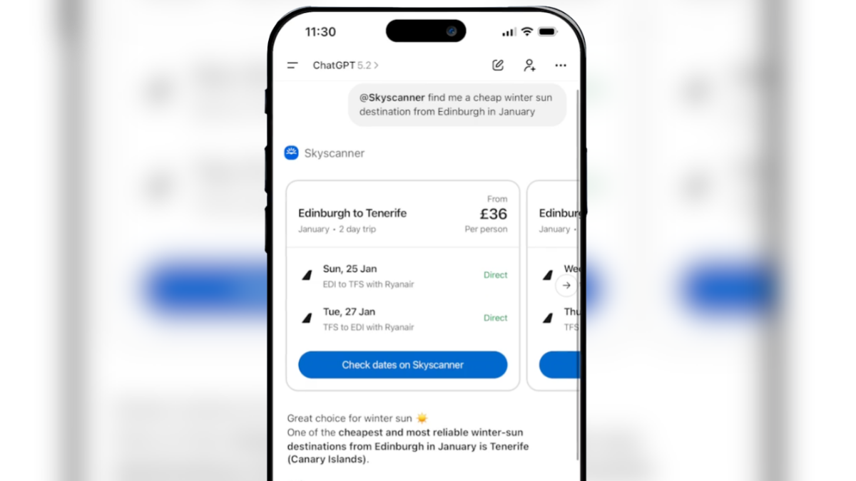The tool is available through the ChatGPT App Store. Once installed, travellers can query the Skyscanner app using plain language — prompts such as “@skyscanner find me the cheapest flight to New York in December” return live flight results displayed visually within the chat interface. Users can then refine searches by adjusting travel dates or departure airports through follow-up messages.