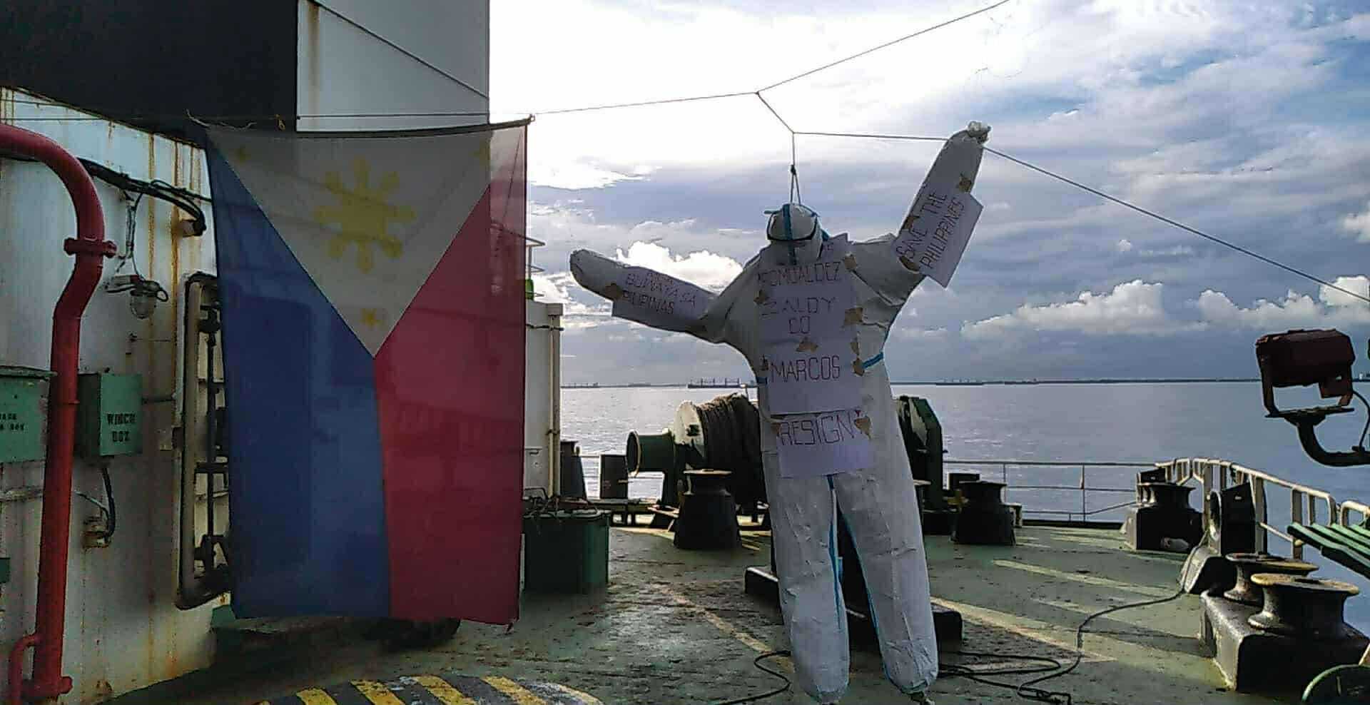 The overseas workers expressed their frustration by placing a makeshift “dummy” figure on board their ship, boldly carrying the words “SAVE THE PHILIPPINES.”