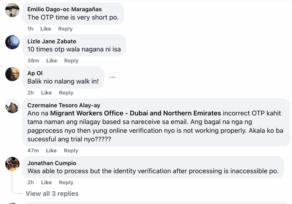Czermaine Tesoro Alay-ay addressed the Migrant Workers Office directly in her comment: “Incorrect OTP kahit tama naman ang nilagay based sa nareceive sa email… then yung online verification nyo is not working properly. Akala ko ba successful ang trial nyo?”