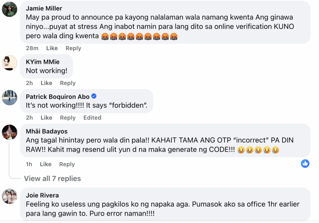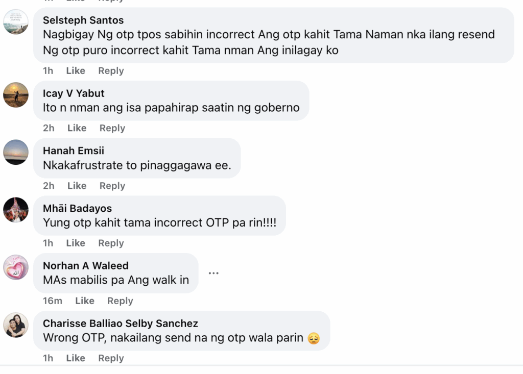 “10 times otp wala nagana ni isa,” said user Lizle Jane Zabate. Similarly, another frustrated user, Mhài Badayos, shared, “Ang tagal hinintay pero wala din pala!! KAHIT TAMA ANG OTP ‘incorrect’ PA DIN RAW!!” These sentiments were echoed by several other comments that pointed out the same issue: the system fails to recognize correct OTPs or does not send them at all.