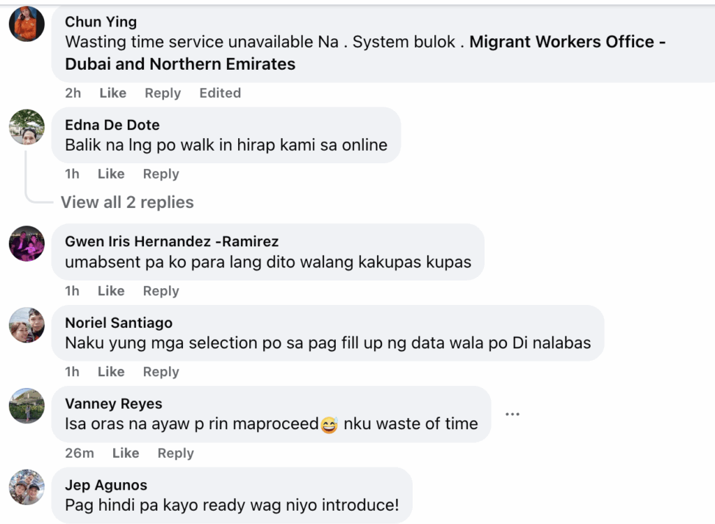 While the platform was meant to eliminate the need for physical visits and reduce administrative burdens, many OFWs are now calling for a return to the old system. “Balik nio nalang walk in!” urged one commenter. Norhan A Waleed added, “Mas mabilis pa ang walk in,” expressing disappointment over the online platform’s reliability.