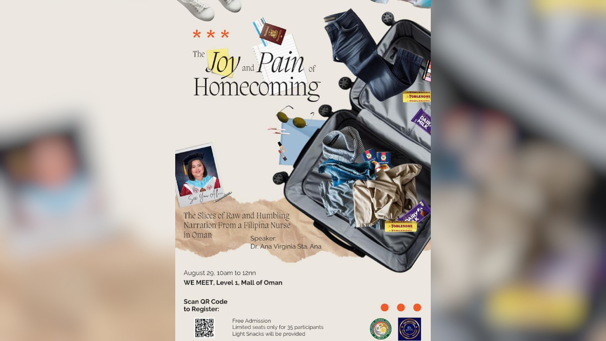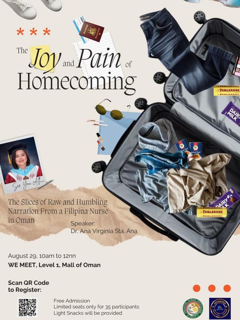 Titled “The Joy and Pain of Homecoming: The Slices of Raw and Humbling Narration from a Filipina Nurse in Oman”, the event is a collaboration between the Philippine Nurses Association of Oman, Inc. (PNAO), HR Matrix International Manpower, and Top Rank International. It will take place simultaneously in two formats: a live session in Muscat, Oman, and a global webinar via Zoom.