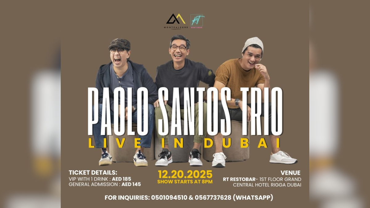 Tickets are now available online via the official Zbooni link: https://PaoloSantosTrio-LiveinDubai.zbooni.com. VIP tickets, which include one drink, are priced at AED 185, while General Admission tickets cost AED 145. For inquiries and reservations, fans may contact 050 109 4510 or 056 773 7628, or send a message to the Montealegre Entertainment Productions UAE Facebook page.