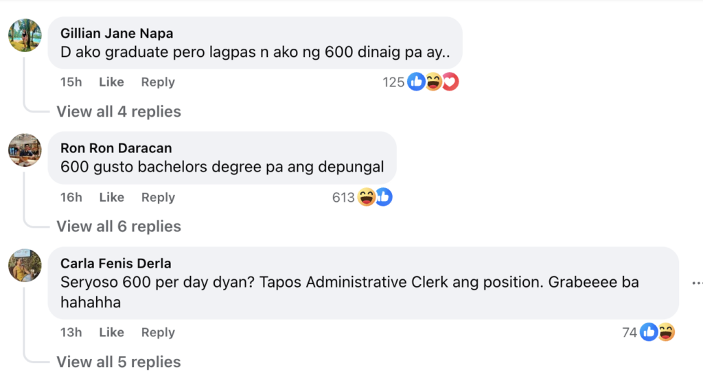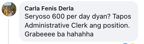 “Seryoso 600 per day dyan? Tapos Administrative Clerk ang position. Grabeeee ba hahahha,” added Carla Fenis Derla.