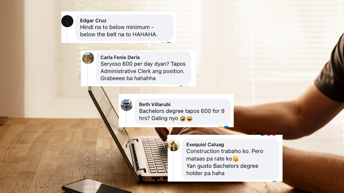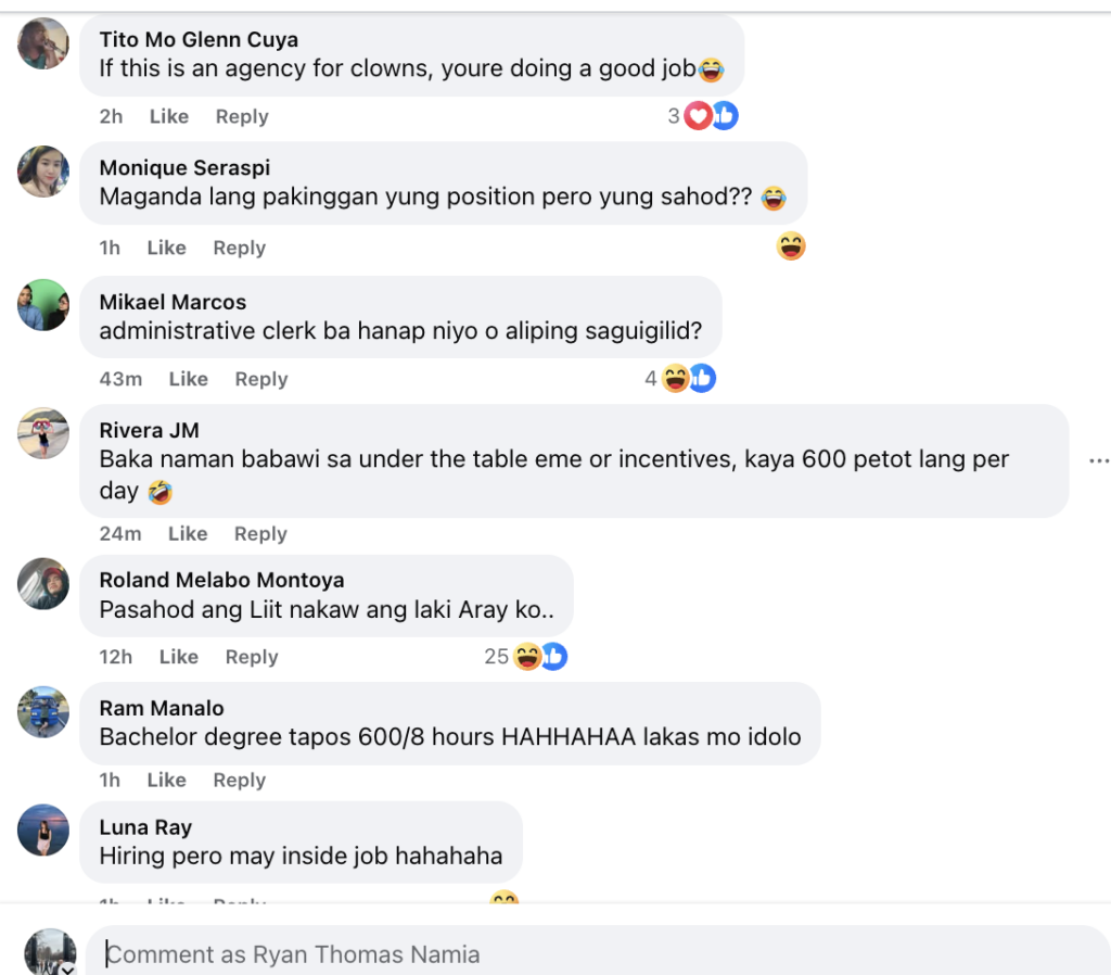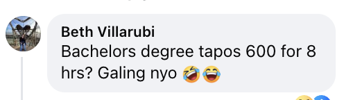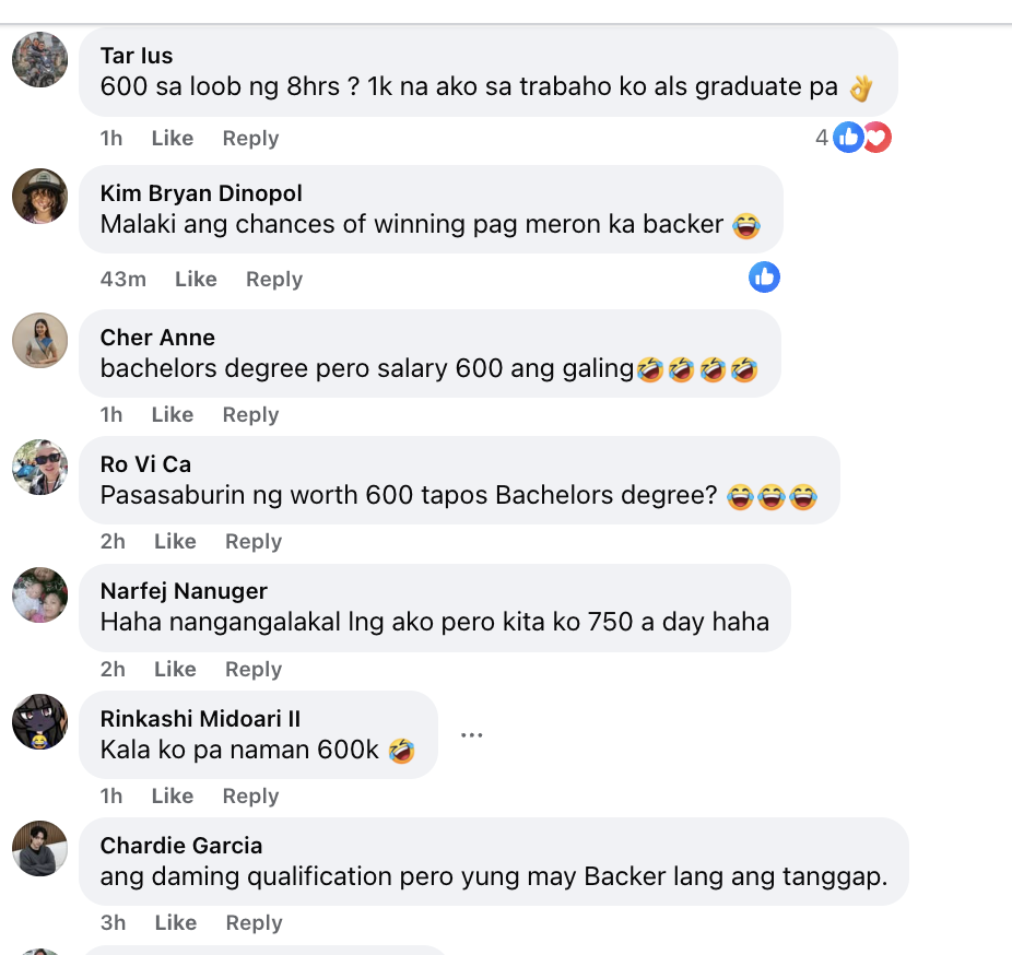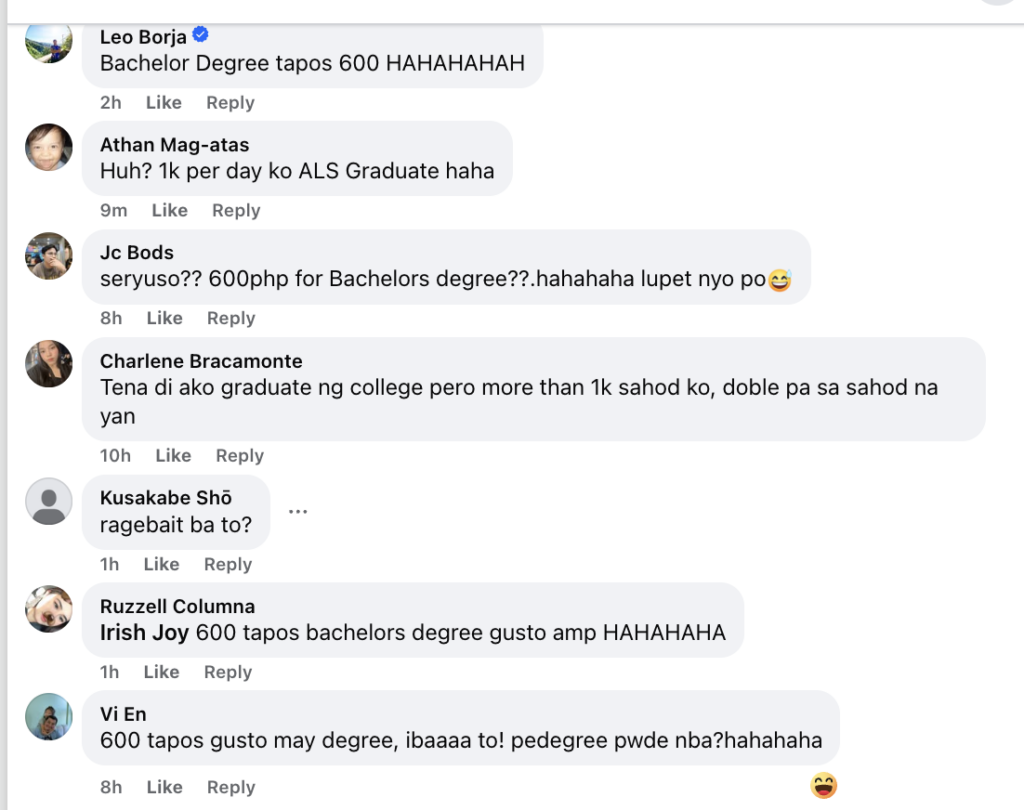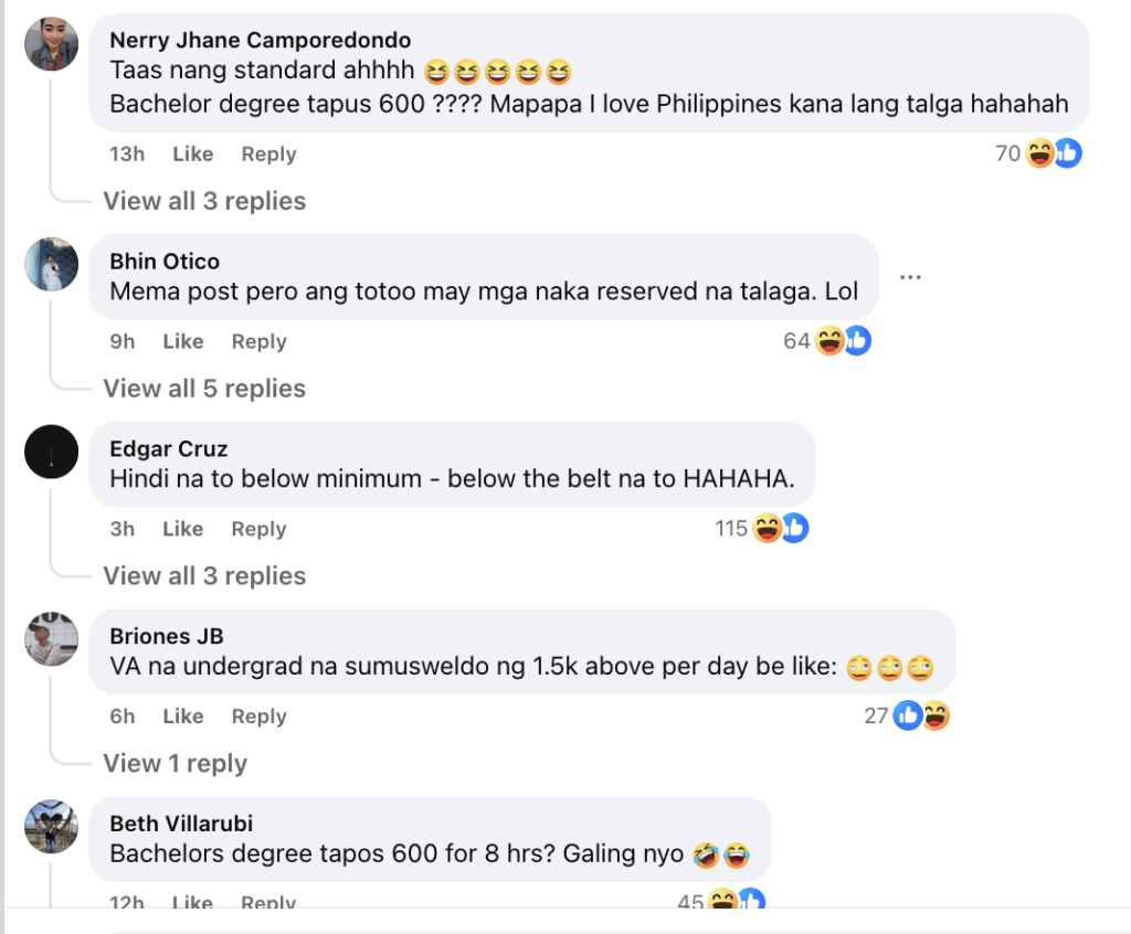 The criticism extended beyond the pay itself. “Hindi na to below minimum — below the belt na to HAHAHA,” wrote Edgar Cruz. Beth Villarubi framed it bluntly: “Bachelors degree tapos 600 for 8 hrs? Galing nyo.”