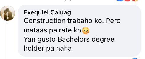 The contrast was sharpened by commenters who noted that virtual assistants, construction workers, and informal traders reported earning significantly more. “VA na undergrad na sumusweldo ng 1.5k above per day be like,” wrote Briones JB. Commenter Exequiel Caluag noted: “Construction trabaho ko. Pero mataas pa rate ko. Yan gusto Bachelors degree holder pa haha.” Another, Tar Ius, wrote: “600 sa loob ng 8hrs? 1k na ako sa trabaho ko als graduate pa.”