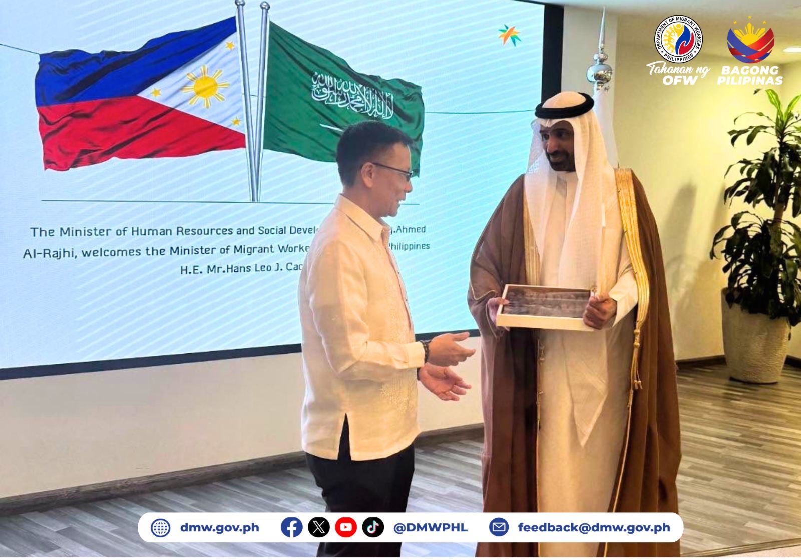 Al-Rajhi received Cacdac at the meeting, where the two discussed issues of common interest relating to OFW welfare and protection in the Kingdom.